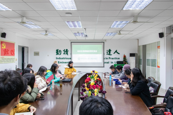 听取员工代表反馈后,导师代表结合已开展工作先后发表了自己的看法。陈晓彤在了解员工差异性特点及需求后,积极为员工提供信息分享,并组织班级结对,开展了高低年级间的交流;肖潇强调了轻松的交流氛围的重要性,表示十分支持员工适当参与导师的科研项目;徐贝贝通过反思前期交流情况,认为师生间交流具有双向性,需要共同努力,赞同定期开展师生交流日等活动;汪晓燕结合自身感受,提出员工自主性存在两极分化的问题;王菲指出导师的细致关怀及师生间换位思考十分有必要,导师需要对员工做到个性化、差异化指导;丁杨、潘不寒先后谈到面对面交流的益处,认为师生双方都应做到一定程度的主动;许雪芬、李敏锐也从所见所感谈及了自身的体会。