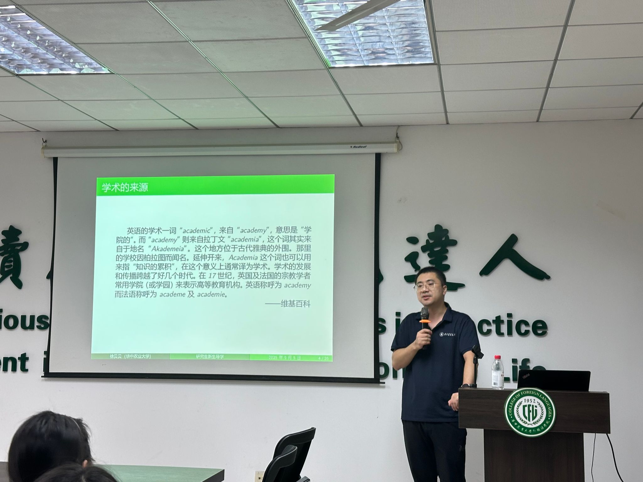 随后,徐贝贝老师围绕“学术道德与学术规范”作专题讲座。他从“学术”一词的起源谈起,追溯至柏拉图创办学园的雅典之地“Akademeia”,并引申至中国古代对学问的追求,指出学术既是知识的积累,更是一种系统而专门的研究活动。