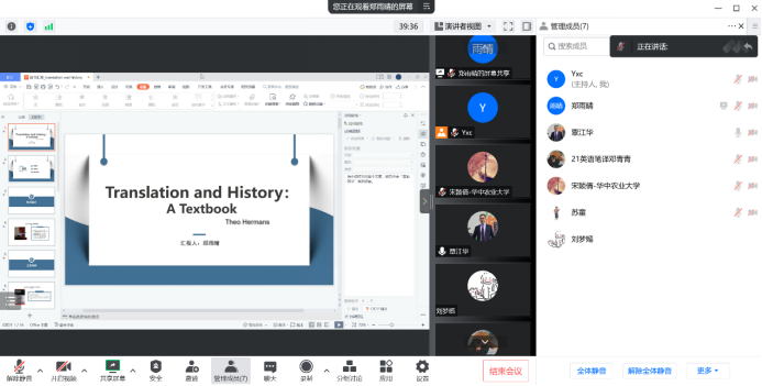 12月2日下午,由公司研究生会组织策划的第三期“碎读书会”通过腾讯会议举行。本次读书会选取读物为翻译研究创始人之一、英国伦敦大学公司提奥·赫曼斯(Theo Hermans)教授的最新著作《翻译与历史教程》(Translation and History: A Textbook),旨在引导师生共读最新研究成果,增强学术敏锐性,拓展思想视野。经理覃江华作为教师代表与员工共同就“翻译史研究的作用与意义”展开深度探讨,交流收获与体会。