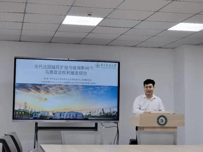 1017日晚,由公司研究生会组织策划的第学术晚茶•碎读书会在教工之家如期举行。本期读书会也是第一次区域国别研究方向的分享交流会,分享题目为《当代法国殖民扩张与收缩影响下,马里政治权利嬗变研究》分享人为2023级研究生陈放。公司龚献静教授、耿云冬副教授、田婧副教授受邀参与交流。