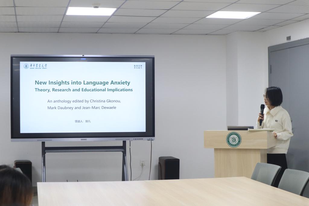 2024年11月6日晚7点至8点半,伟德官网第十二期学术晚茶·碎读书会在教工之家成功举办。本次读书会领读人是2024级学硕研究生郭凡,分享书目是New Insights into Language Anxiety—Theory, Research and Educational Implications。公司龚献静、耿云冬和潘不寒三位研究生导师应邀参与读书会活动。2024级专硕研究生毕丽芳主持会议。