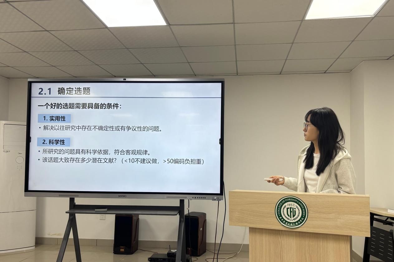 本次工作坊让研究生对语言研究方法有了进一步的认识,参与者纷纷表示收获颇丰。2023级硕士生纪宜文表示:“此次工作坊的三位汇报人分别介绍了元分析、Q方法和定性研究这三种方法,还通过实操演示了如何将研究方法应用到实际研究当中,这极大加深了我对语言研究的兴趣。”2024级硕士生王统认为:“此次‘语言研究方法工作坊’使我受益匪浅。通过老师和同学们的分享,我不仅感受到了语言研究的魅力,更学到了实用的研究方法。陈婧老师讲的定性研究部分对我帮助极大,她通过对比定量和定性研究方法,结合自身经验详细讲解了主题分析法的操作步骤,让我非常期待接下来将这一方法运用到自己的研究中。”