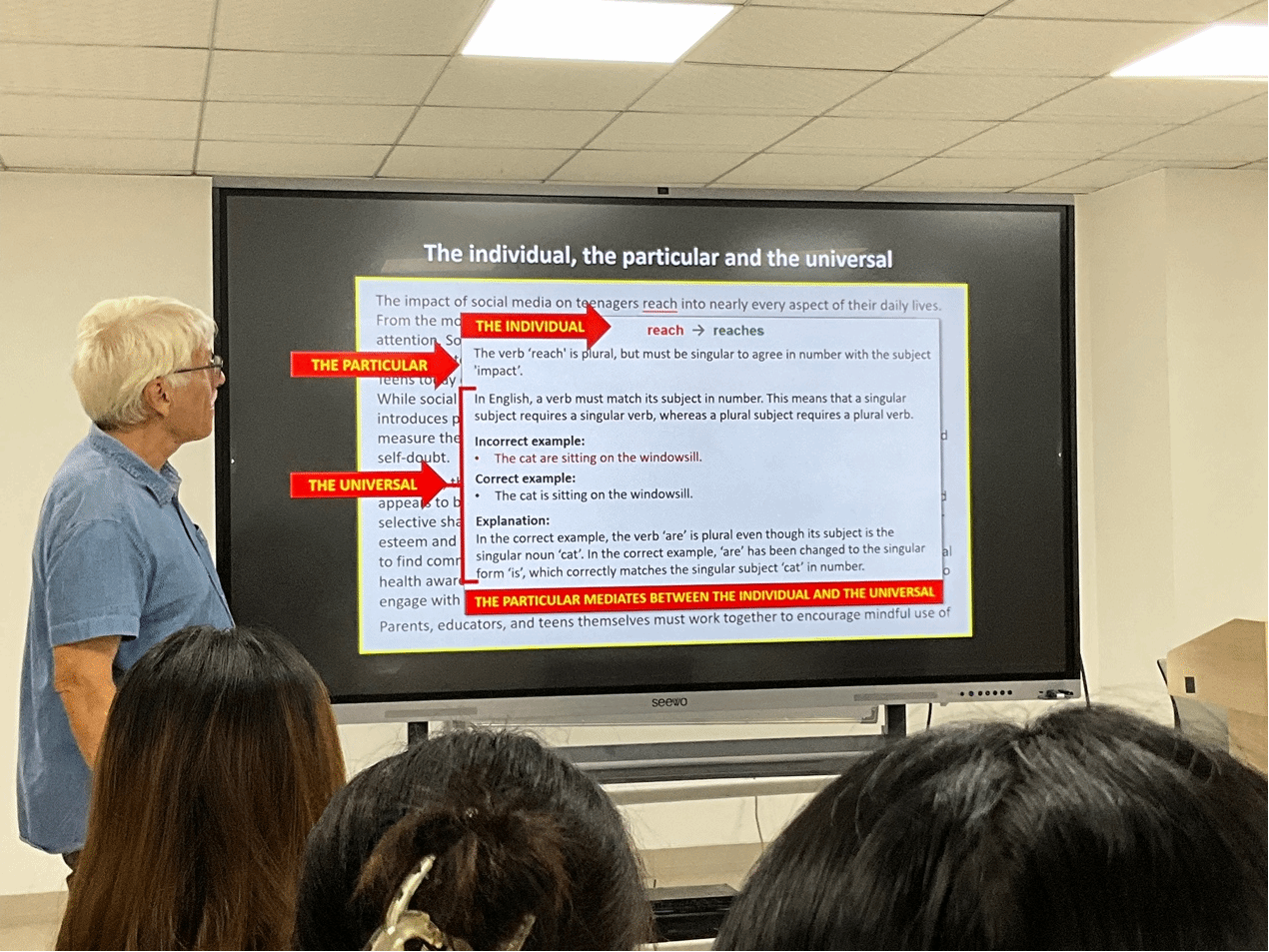 随后,Tarp教授以口语交际为例,通过引用黑格尔“普遍性、特殊性和个体性”(the universal, the particular and the individual)的哲学概念,深入阐释了简短注释如何在学习者个人错误与大篇幅的语法注释之间发挥中介作用,实现附带学习(incidental learning)和有意学习(intentional learning)的兼容、转化。