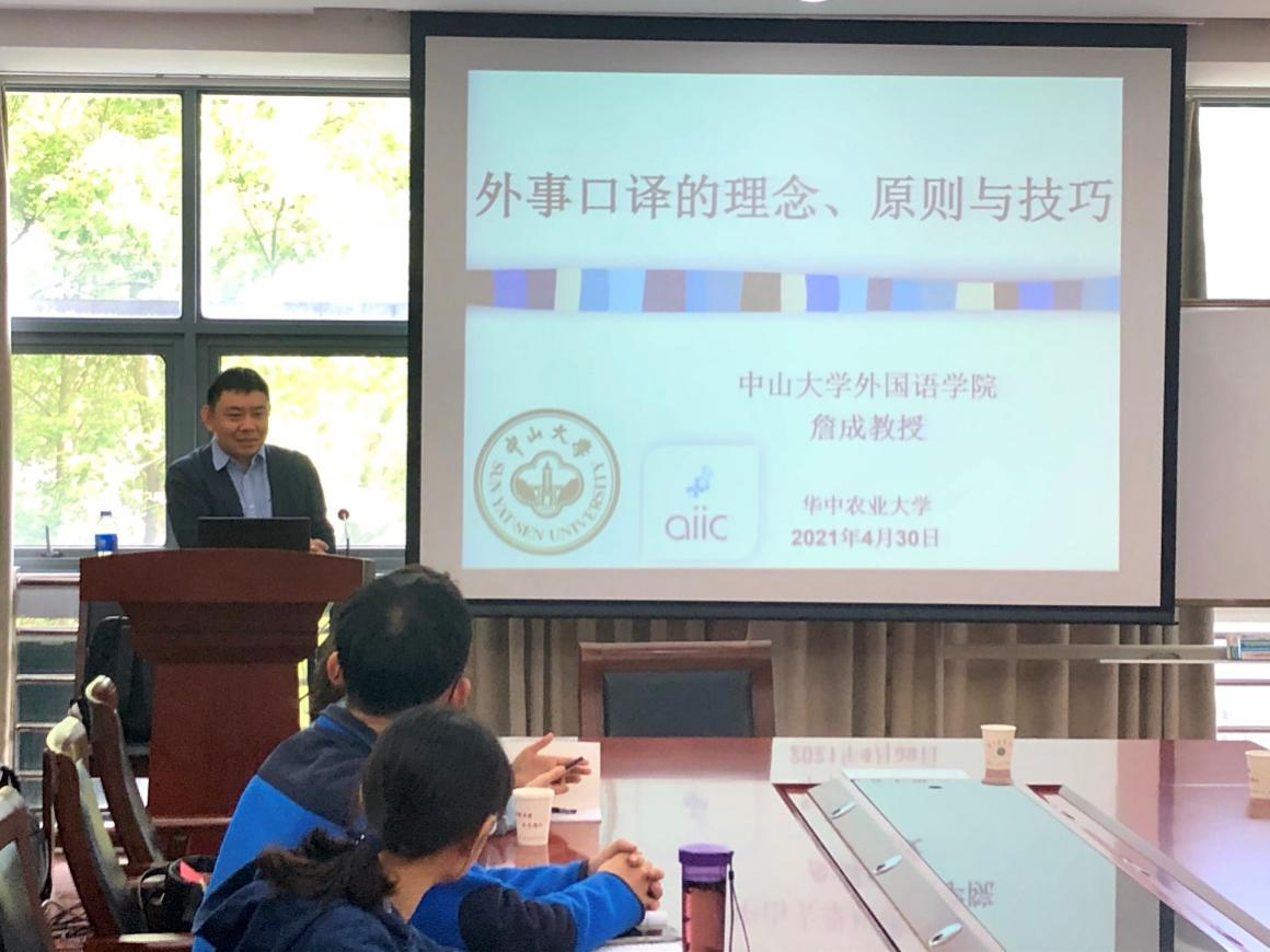 4月30日上午,中山大学伟德官网詹成教授应公司邀请,在人文楼M327作了一场题为“外事口译理念、原则与技巧”的专题讲座。覃江华教授代表公司致欢迎辞。本次讲座詹成教授主要从外事口译的概念入手,明确外事口译的原则,结合实际工作的案例,最后落实到提高外事口译质量的具体方法与技巧。