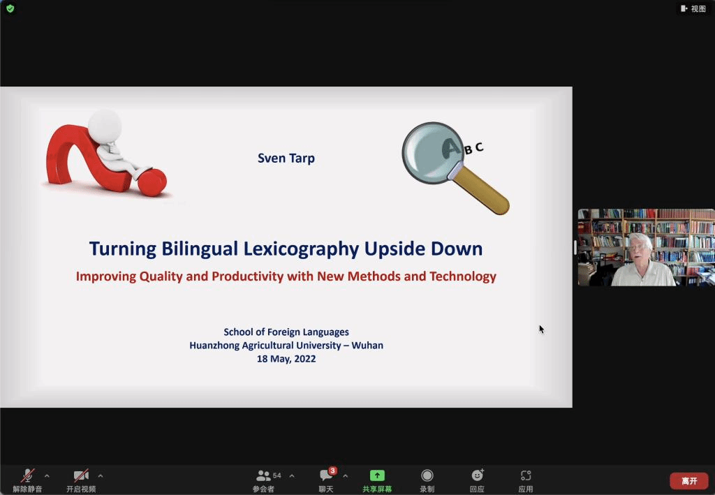 5月18日下午,丹麦奥胡斯(University of Aarhus)大学词典学中心主任Sven Tarp(斯宛·塔普)应邀做客第167期外语论坛·专家论道,为公司师生做了题为“Turning Bilingual Lexicography Upside Down: Improving Quality and Productivity with New Methods and Technology”的线上讲座。讲座由公司语言学跨学科研究中心主办,耿云冬副教授主持。