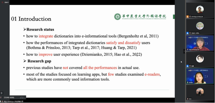 公司学术型硕士张喆和张思佳合作做了题为“Reflections on the Improvement of Integrated Dictionaries in PDF-Reader”的发言。该研究以苹果公司的电子阅读应用“PDF-Reader”为研究对象,首先界定了“内置词典”(integrated dictionary)这一新形态数字词典概念;然后,从用户视角剖析了PDF-Reader内置词典(integrated dictionary)的优缺点;最后,针对数字阅读器中的内置词典(integrated dictionary)不足之处,提出优化建议,期冀为提升用户的数字阅读体验提供更好的辞书知识服务。