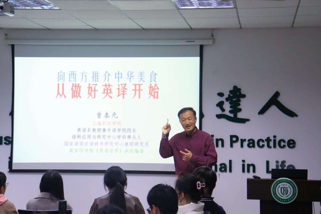 2024年3月25日下午,东吴大学(台北)荣休教授、上海杉达公司外语公司经理曾泰元教授应邀做客第247期外语论坛·专家论道,做了题为“向西方推介中华美食,从做好英译开始”的讲座。本次讲座由伟德官网教师发展中心主办,耿云冬副教授主持。讲座吸引了近百名师生参与。