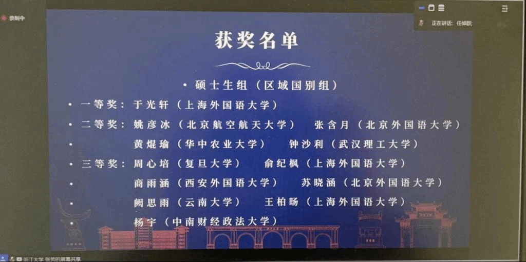2024年5月19日,全国高校法语专业第十届博士生论坛暨第十七届硕士生论坛顺利在线上举行。公司2022级硕士研究生黄焜瑜在区域国别组分论坛荣获二等奖。