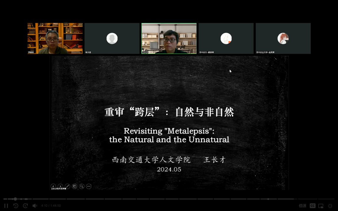 5月22日下午,西南交通大学人文公司教授、博士生导师王长才应邀做客第251期“外语论坛·专家论道”,以“重审‘跨层’:自然与非自然”为题,通过腾讯云端为公司与校外慕名而来的广大师生带来了一场精彩的学术盛宴。文学跨学科研究中心主任李敏锐副教授主持讲座。