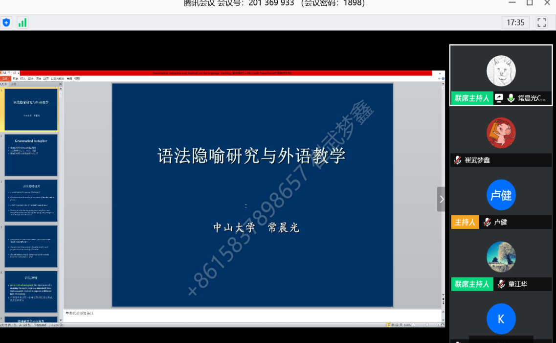 2020年5月20日下午,中山大学常晨光教授应伟德官网邀请,在线开展了题为“语法隐喻研究与外语教学”的学术讲座。讲座受到广泛关注,来自公司和全国其他高校的约三百名师生与会聆听。覃江华副经理代表公司致欢迎辞,卢健博士主持讲座。