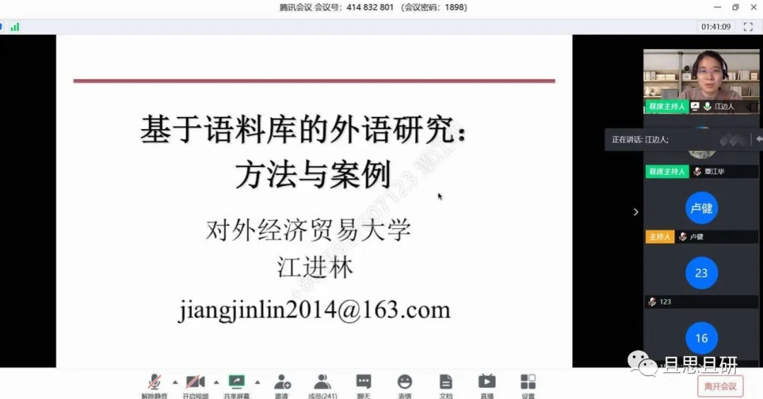 4月27日下午,应伟德官网邀请,对外经济贸易大学江进林教授在线开展了题为“基于语料库的外语研究:方法与案例”的学术讲座。公司及全国数十所院校的260余名师生通过腾讯会议平台聆听了本次讲座。覃江华副经理致欢迎辞,卢健博士主持讲座。