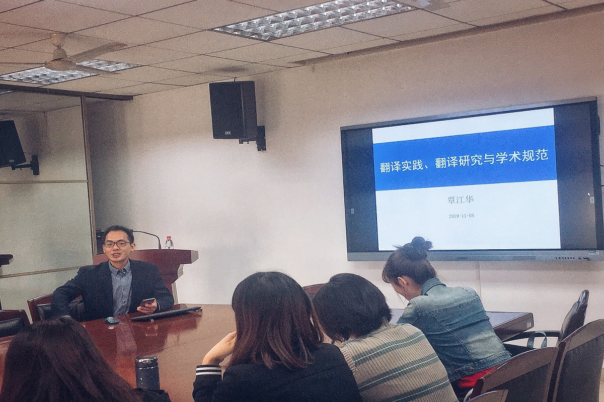 11月8号上午10点,覃江华副教授在人文楼附楼二楼A201会议室为大家带来了一场题为“翻译实践、翻译研究与学术规范”的讲座。公司19级全体研究生到场聆听学习。