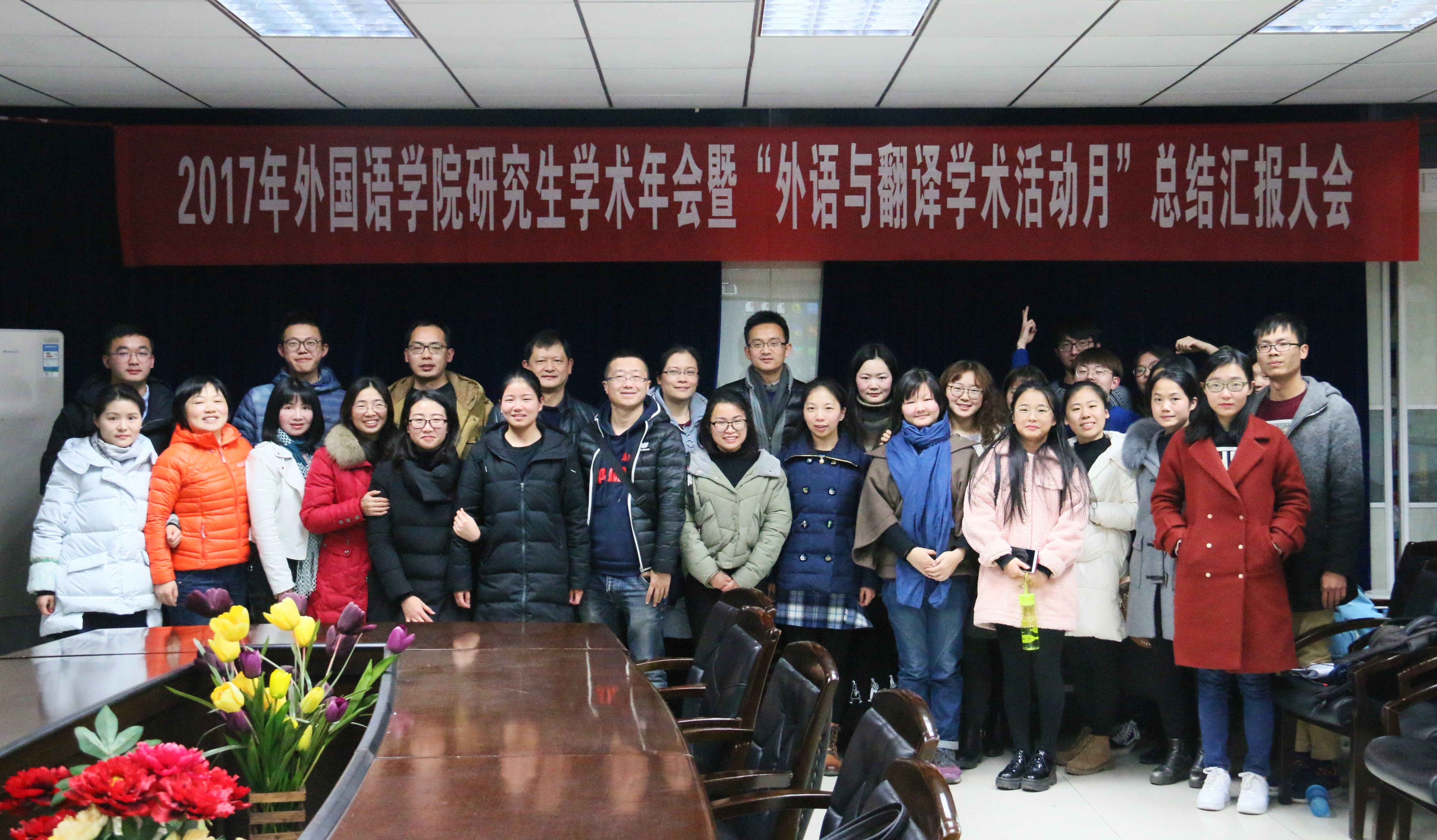 12月21号晚7时,2017年伟德官网研究生学术年会暨“外语与翻译学术活动月”总结汇报大会在外报A102会议室举行。公司党委副书记杨成才、公司副经理杨革新、研究生导师曾文华、龚献静、袁谦、覃江华、张瑞嵘等莅临现场。全体2017级研究生参加了本次汇报。