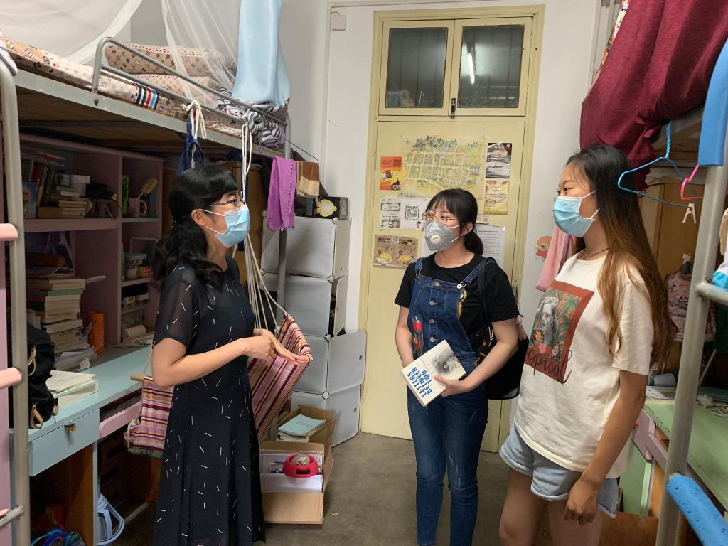 “欢迎你们返校,你们都还好吗?”在荟三622寝室,公司辅导员张亚男悉心地问候已经返校的同学。就在前一天,6月17日中午,张亚男已带领王欢慧、朱玲两位辅导员对公司55间毕业生寝室进行了全面排查,确保171名返校员工到校后寝室能够正常供水供电。为了方便毕业生办理退宿手续,张亚男还协助楼管工作人员清理了所有毕业生的房源和住宿登记情况。