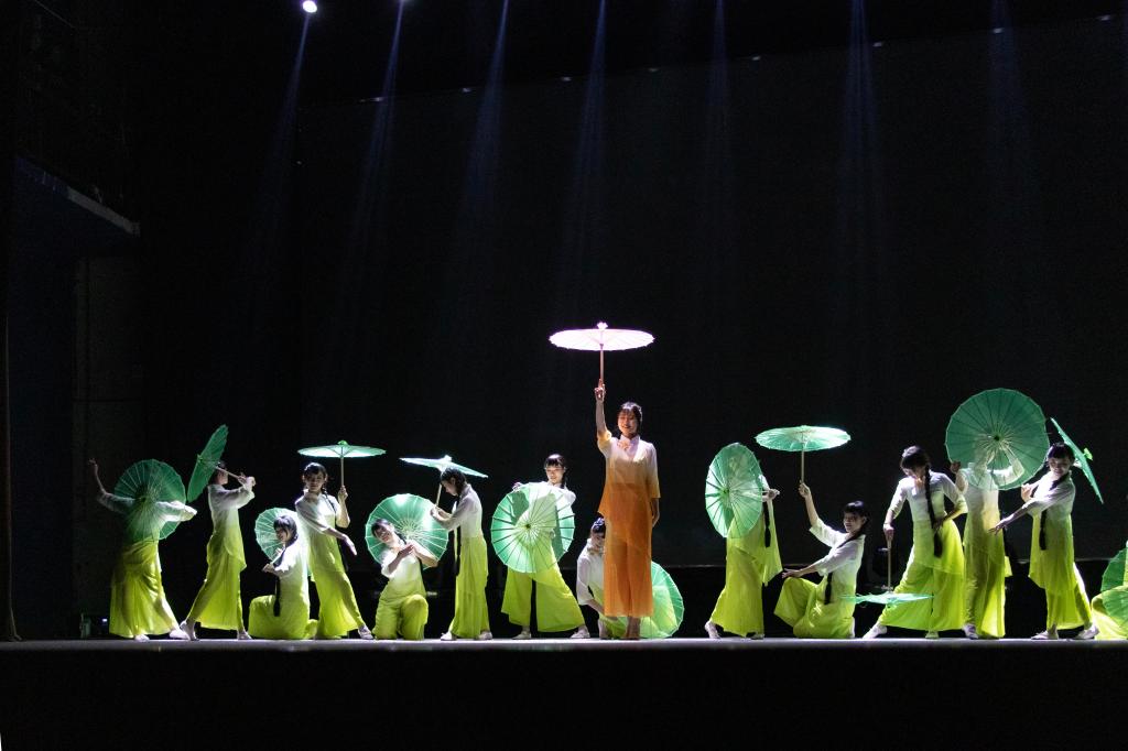 黑暗褪去,轻快的音乐响起,17位佳人身着一袭绿裙,手执油纸伞,迈着婀娜的步伐走来。一把薄荷绿的油纸伞,撑开是一方芭蕉的天地,合上是一场温柔的细雨,一开一合之间,尽显表演者的俏皮可爱。此刻,她们甜美的微笑仿佛带着沁人心脾的芭蕉香气,娉婷的舞姿更是让人联想到“所谓伊人,在水一方”之景,赢得观众热烈掌声。