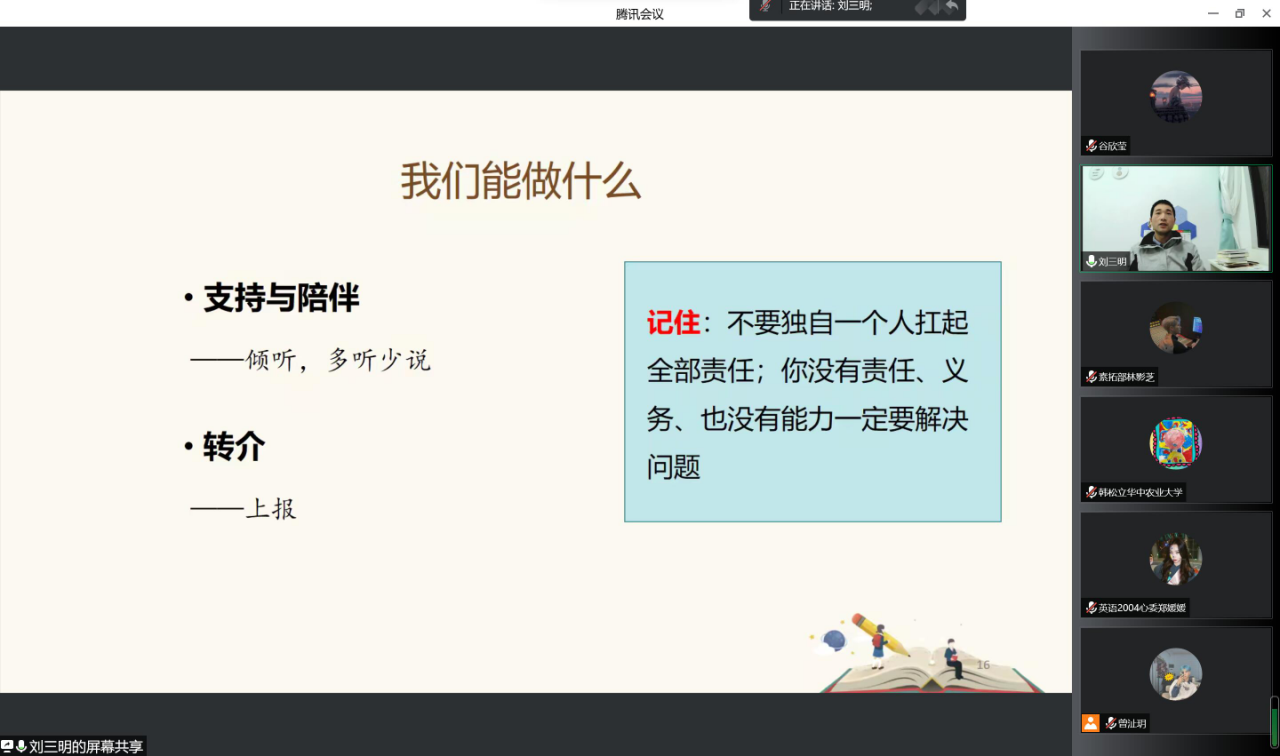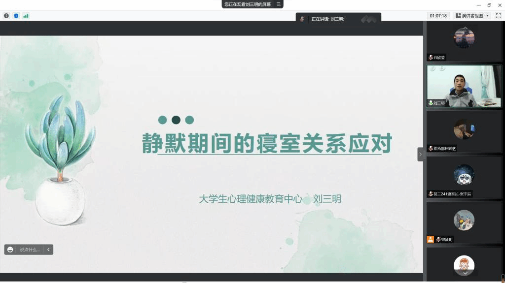 第二场讲座刘老师向大家介绍了如何应对静默期间的寝室关系,在寝室中如何与室友和睦相处,避免或减少矛盾的发生,尤其是在疫情封控等不可抗力因素的情况下怎样调节人际关系,以及矛盾发生后正确的处理方式等等。