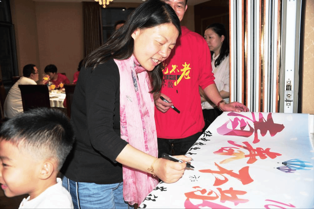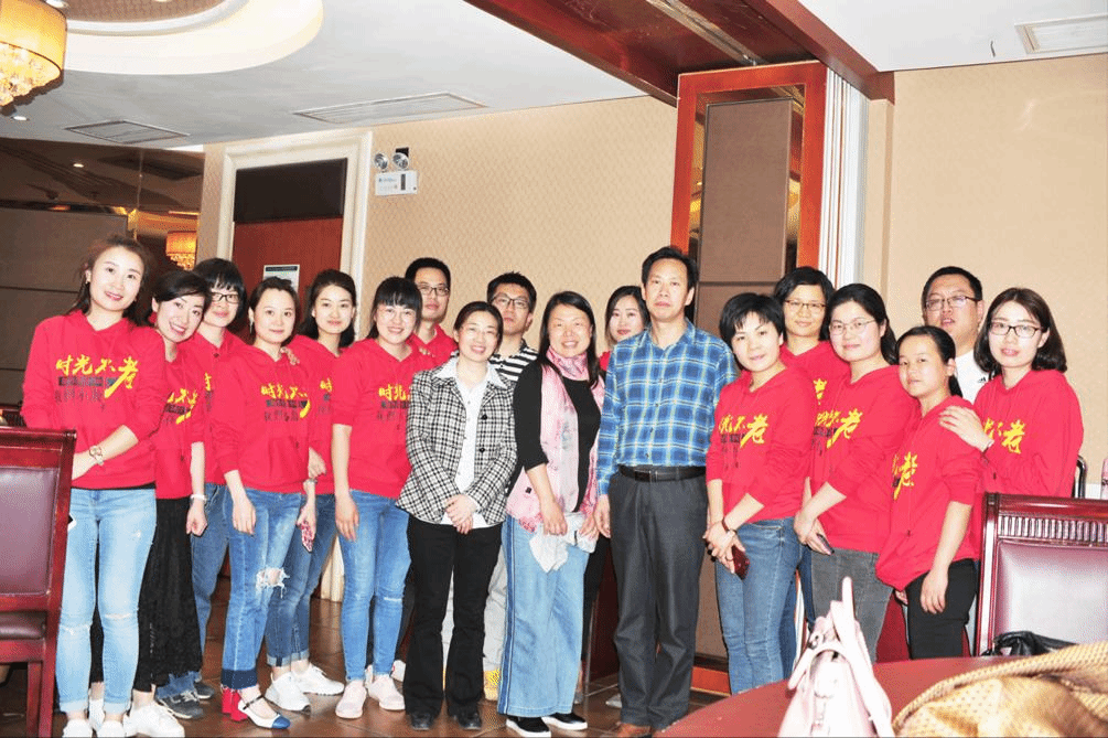 晚餐就定在校内的国际学术交流中心,这次聚会本没想惊动公司领导,只邀请了班主任方红老师,但没料到的是,因为今年正值华农120周年校庆,也是外语系成立25周年,公司领导对员工们的回校重聚很是重视。正当大家围桌而坐、促膝而谈的时候,领导们牺牲周末的休息时间,来跟大家短暂会面,公司党委王平祥书记、MTI中心主任曾文华副教授跟大家聚集在一起拍照留念,并在特别为聚会制作的横幅上签字。至此,掀起了聚会的另一个高潮。