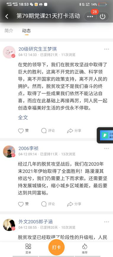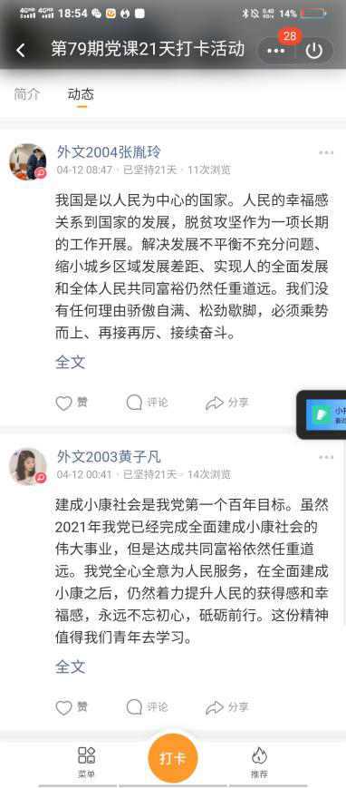 在4月11日关于“习近平论教育引导全党以史为镜,以史明志”的打卡中,外文2006班杨睿琳谈起了学习党史对于中国共产党发展的作用:“百年风雨,百年辉煌。从‘小小红船’到‘巍巍巨轮’,我们党创造了非凡业绩。历史是最好的教科书。对共产党人来说,中国革命历史是最好的营养。从一个世纪的风云变幻中,中国共产党勇担历史重任,在探索中奋斗,在开拓中前进,推动中国发生了翻天覆地的变化”。