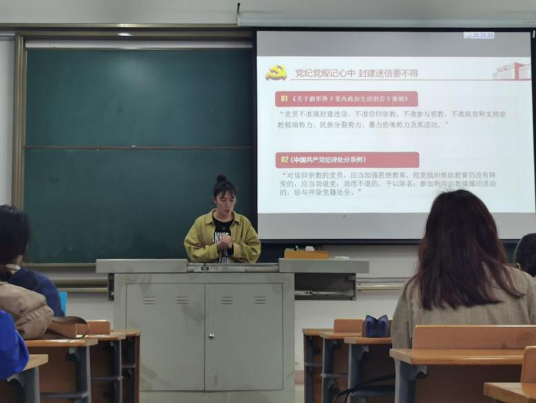 在活动的最后,吕梦佳同志指出:共产党员是比一般公民具有更高政治觉悟、更高政治信仰、更强组织纪律性的“特殊公民”,不仅要遵守国家的法律,还要遵守党的政治纪律和组织纪律。要保持理想信念的不动摇和不滑坡,必须警惕思想滑向封建迷信的深渊,始终坚持马克思主义宗教观。