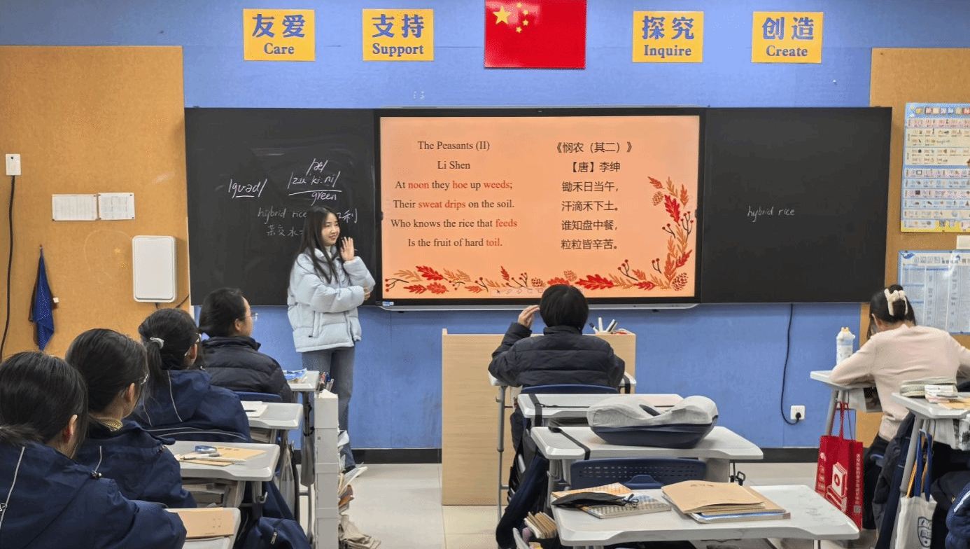 在科普环节,志愿者王艳芳和孙一凡分别带来了农作物和蔬菜名称的英文表达教学。两位志愿者通过提问、展示、朗读和抢答的模式,引导同学们积极参与,使同学们在轻松愉快的氛围中掌握多种农作物和蔬菜的英文名称。志愿者毕丽芳则为同学们带来了《悯农(其二)》的英文版诗歌(许渊冲译),通过朗读诗歌和讲解词汇,让同学们领略了英文版诗歌的韵味,进一步加深了对中国农耕文化的理解和感受。整个科普过程生动有趣,同学们热情参与,课堂氛围十分活跃。