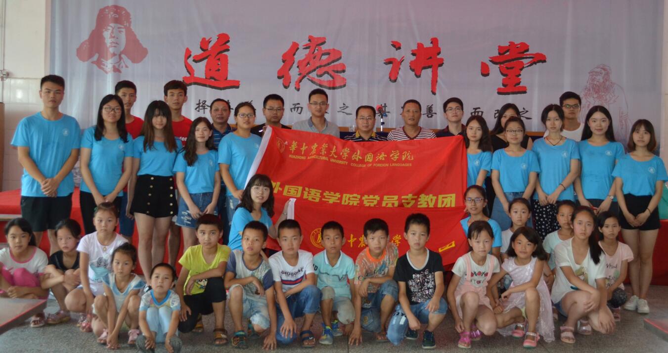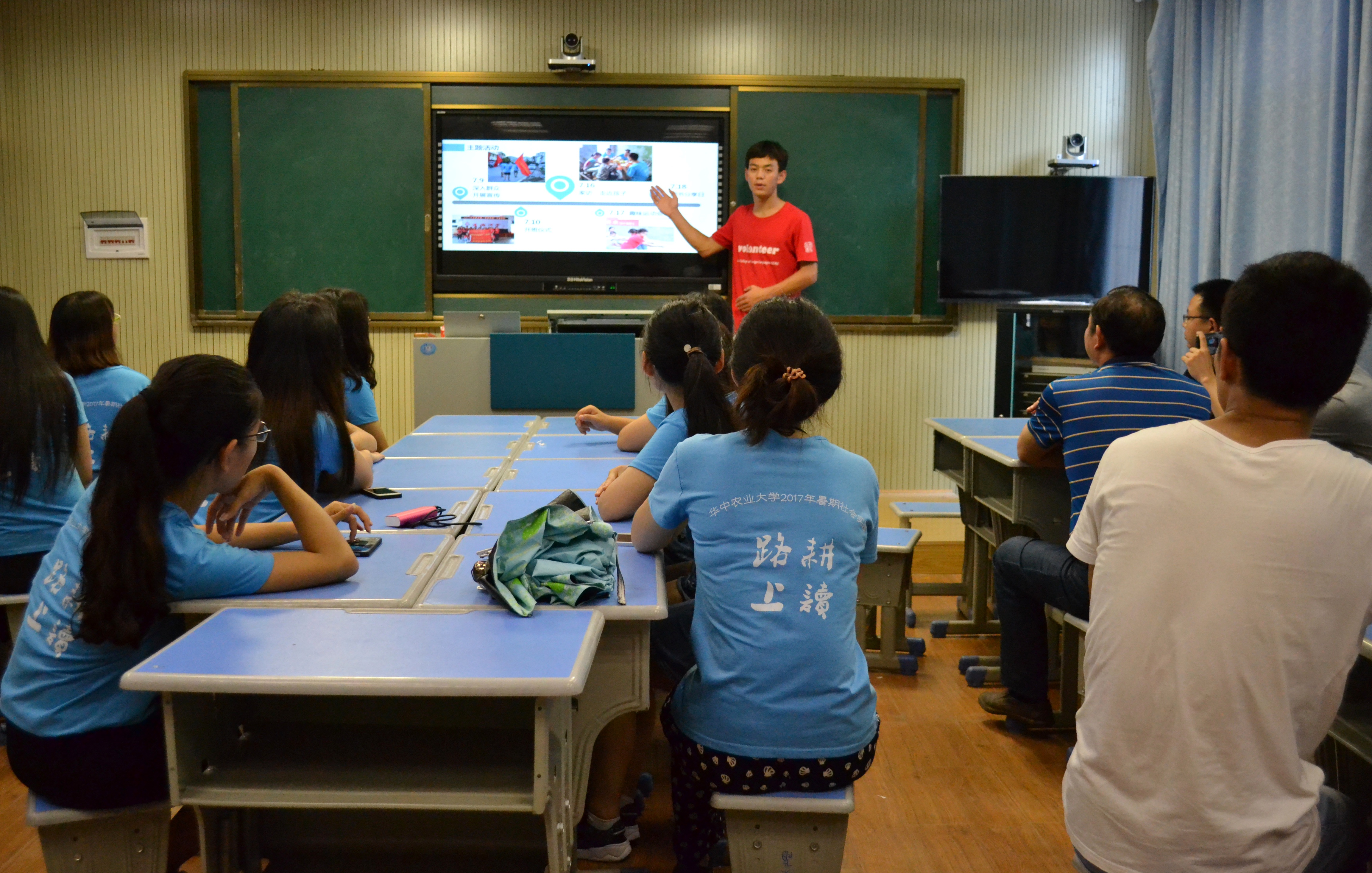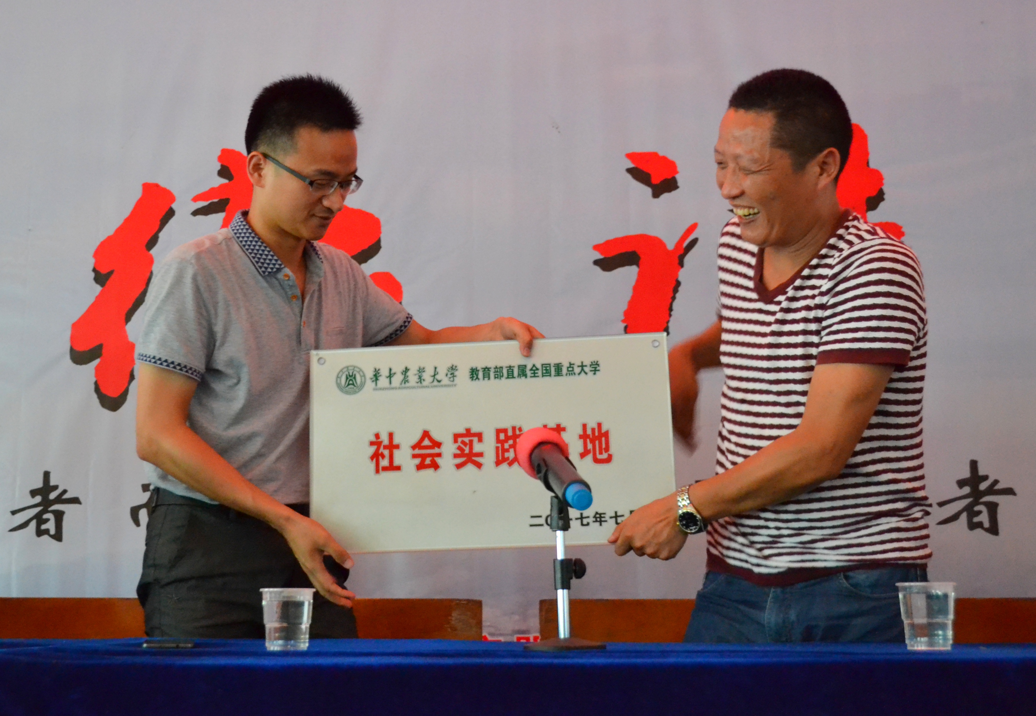 仪式伊始,王云峰进行了致辞,强调了授牌的重要性。他说:“本次暑期社会实践基地挂牌能够促进关爱留守儿童活动进一步发展,以此为契机可以助力精准扶贫和教育扶贫,为孩子们播下学习的种子,成长的基因。”接着,杨成才代表伟德和白桑关镇九年一贯制公司董事长齐随庆签订了教育合作协议并授牌。此后,齐随庆对公司的基本情况进行了汇报。他认为今天的授牌对公司教育发展来说又是一大进步,强调了华农与公司的良好关系。他说:“华农已经成为我们暑假的代名词,每次暑假家长就会询问志愿者什么时候来。希望这次授牌签约能够激励孩子们健康成长,快乐学习。”杨成才则以“感谢”、“感恩”、“感动”三词概括了自己的讲话。他替队员表达了对当地员工以及公司领导的感谢,感谢他们给老员工提供的机会与平台;阐释了志愿者精神,认为教育与陪伴是相互的,感恩常在。他说:“我希望外公司党员支教团活动永不落幕,这样我们才可以永久地诠释华农‘勤读力耕,立己达人’的校训。”