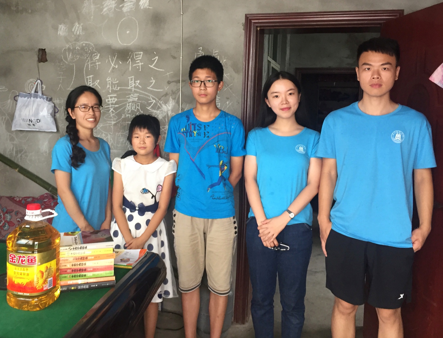 拿着一些书和本子,提着一桶油,队员庄玉蓉、盛锦悦、李泽星和丁梦丽四人来到六年级员工郭雄的家中。