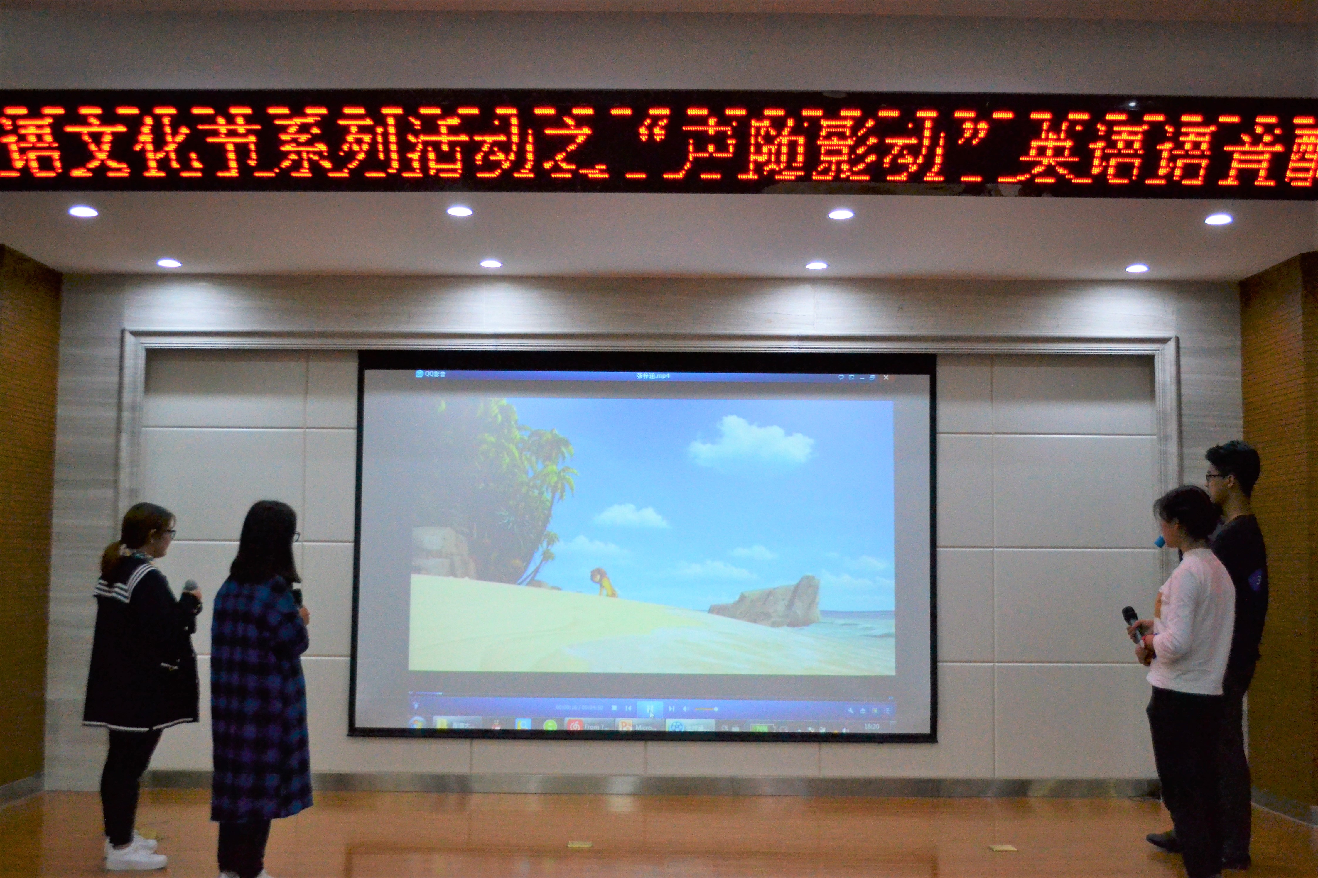 活动伊始,主持人宣读比赛规则和注意事项,随后八组选手按照抽签顺序上台,对赛前准备的视频进行配音。参赛小组选取的配音影片内容广泛,不少角色配音难度较高。这些影片的角色有《超能陆战队》的科技小神童Hiro和超级英雄大白;《马达加斯加》中Alex、Marty、Melman、Gloria这几位能说会闹的好伙伴;《反芭比》中四个前卫活力的年轻女孩雅思米、洁儿、萨莎和克萝......每组选手都尽心尽力地融入剧情,他们的配音不仅发音地道,而且对人物的情绪表达恰如其分,堪比影视原声。经过一轮比拼后,由彭双全带领的第四小组、周媛带领的第七小组、冯可欣带领的第二小组、吴佩伦带领的第八小组以及张梓涵带领的第三小组进入第二轮比赛。在第二轮比赛中,五组选手对指定片段《冰雪奇缘》进行原文配音,参赛者们各展其姿,将自己的创造力发挥的淋漓尽致,配音模仿的惟妙惟肖。观众们在欣赏影片的同时也体验了另一种英语学习的情境。