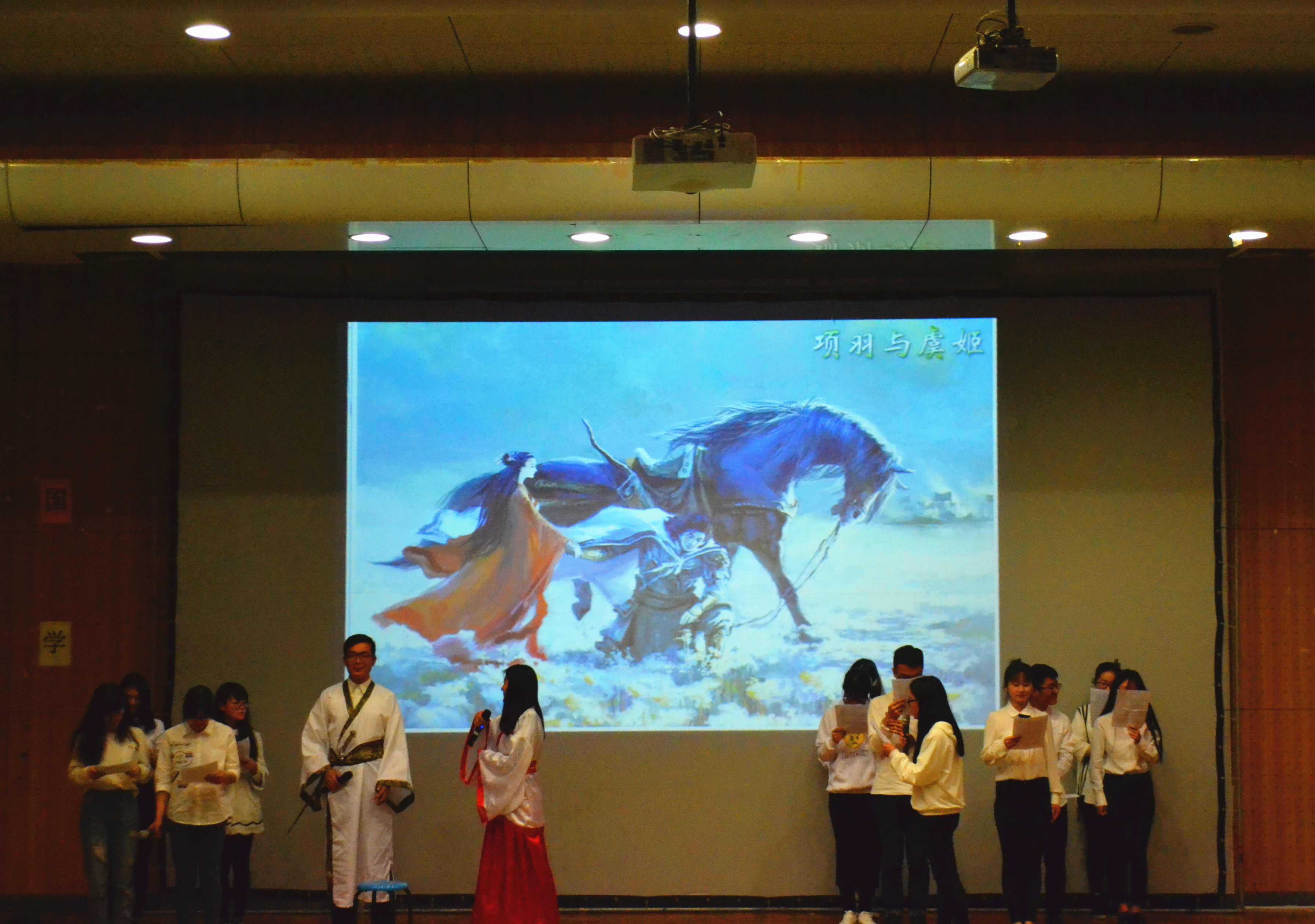 第一个节目是英语1601班的手影操和荧光舞。他们上台之前,灯光突然全部熄灭,引起了台下同学们的好奇。接着,英语1601班的同学们戴着荧光手套走上台,背景音乐《Dream It Possible》响起,十余名同学将双手拼成了飞鸟状,并随着音乐的律动缓缓聚集成一颗爱心。之后,部分同学用双手和印有党徽、团徽的荧光板组成了两个舞动着的小人,其余同学则举起了印有校训的荧光板站在台前,突出了表演的主题。展示完“千手观音”后,他们又表演了炫酷的荧光舞,令观者大呼过瘾。商务英语1603班表演了话剧《四川好人》选段。演员们身着戏服,演得有模有样,观众们看得也是津津有味。商务英语1601班带同学们回顾历史,表演了《乌骓别霸王》。该节目将朗诵与表演巧妙融合在一起:舞台两旁的同学们感情充沛地念着旁白;舞台中央的两位同学身着古装,演绎了项羽在四面楚歌之际与虞姬的生死别离。他们的表演极具感染力,使台下的同学身临其境。而英语1602班表演的舞台剧又将同学们的思绪拉回现实。该剧演绎了老员工活的几个片段:学习生活、纯真的校园爱情和感人的毕业之际,引起了台下观众的共鸣。