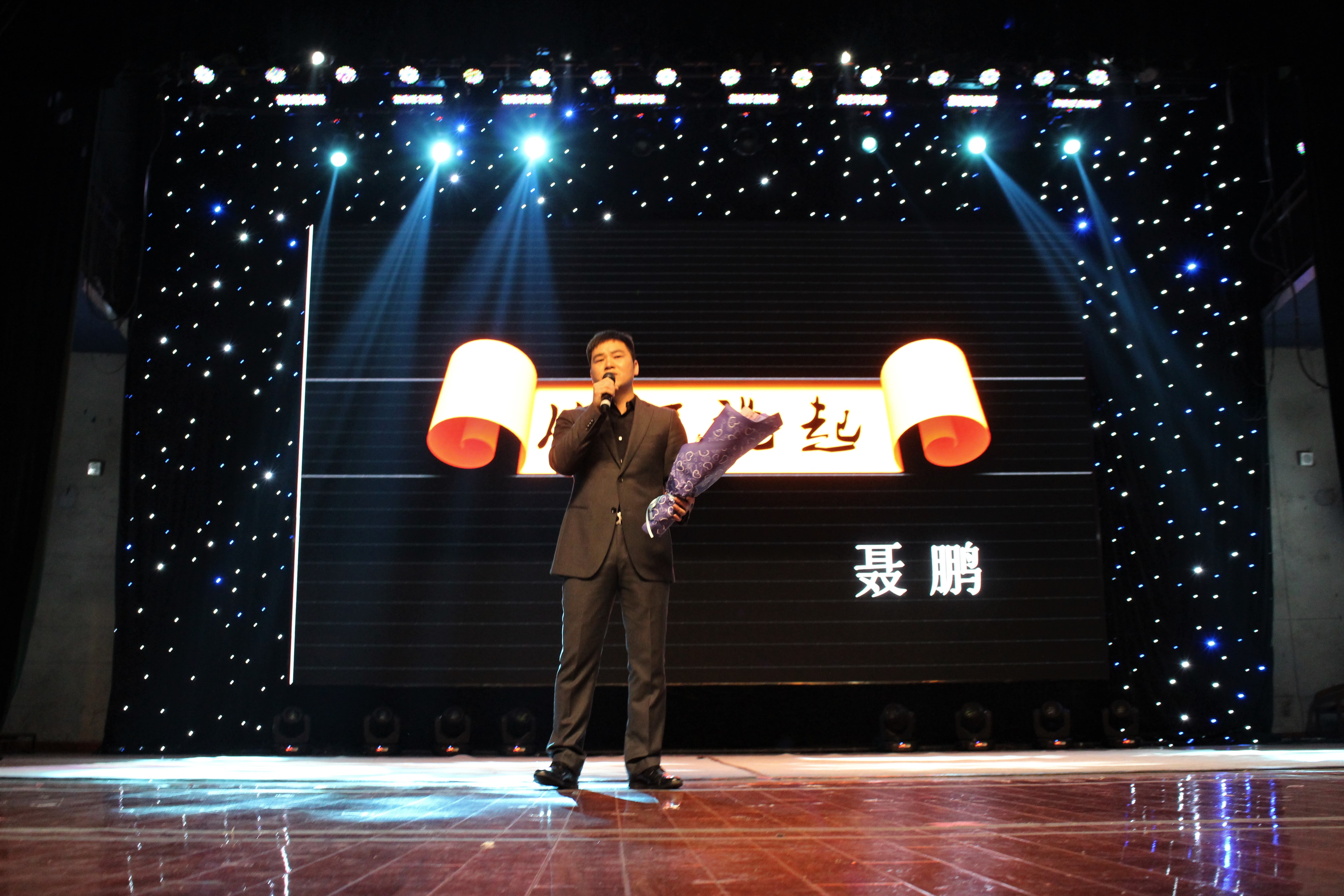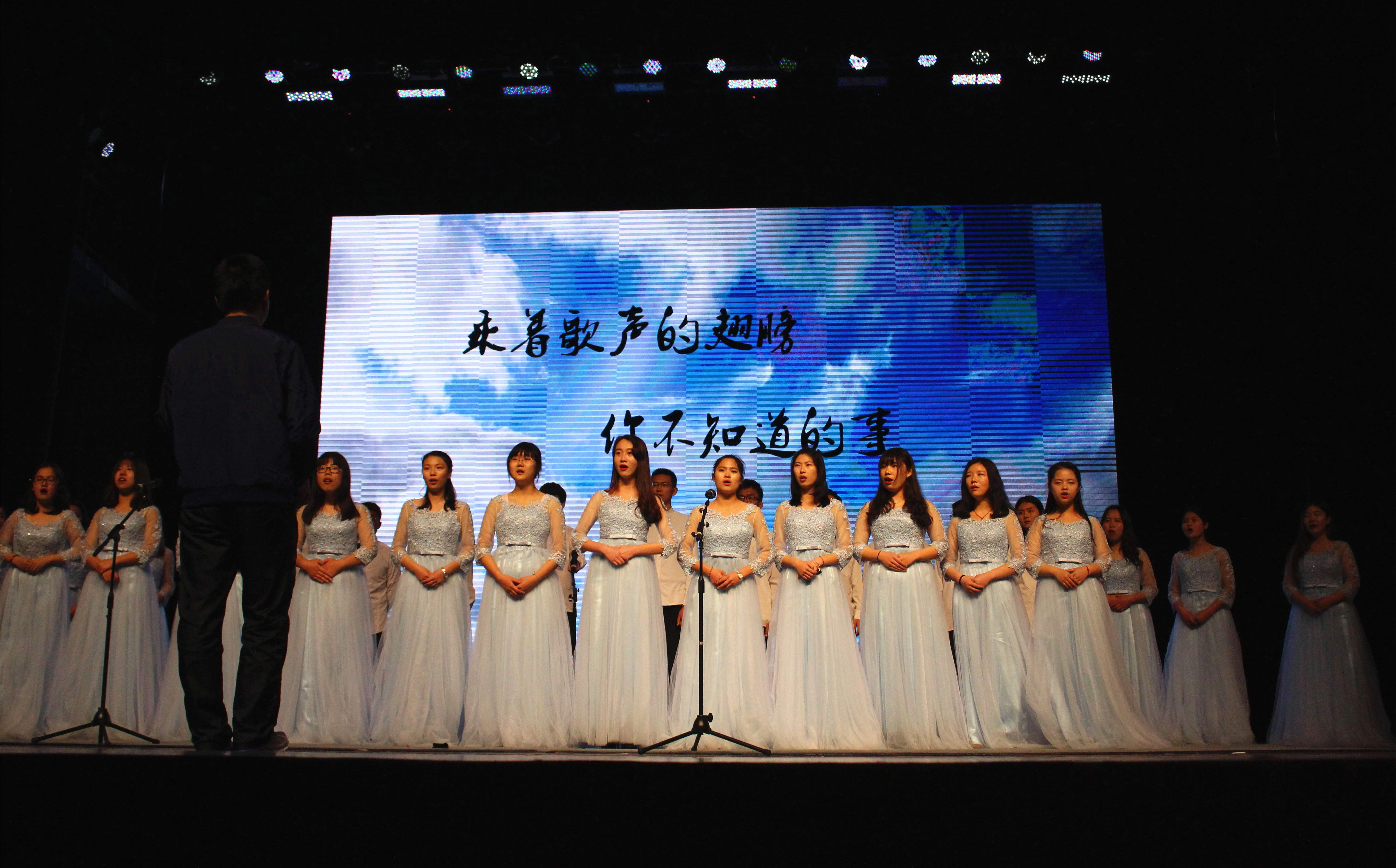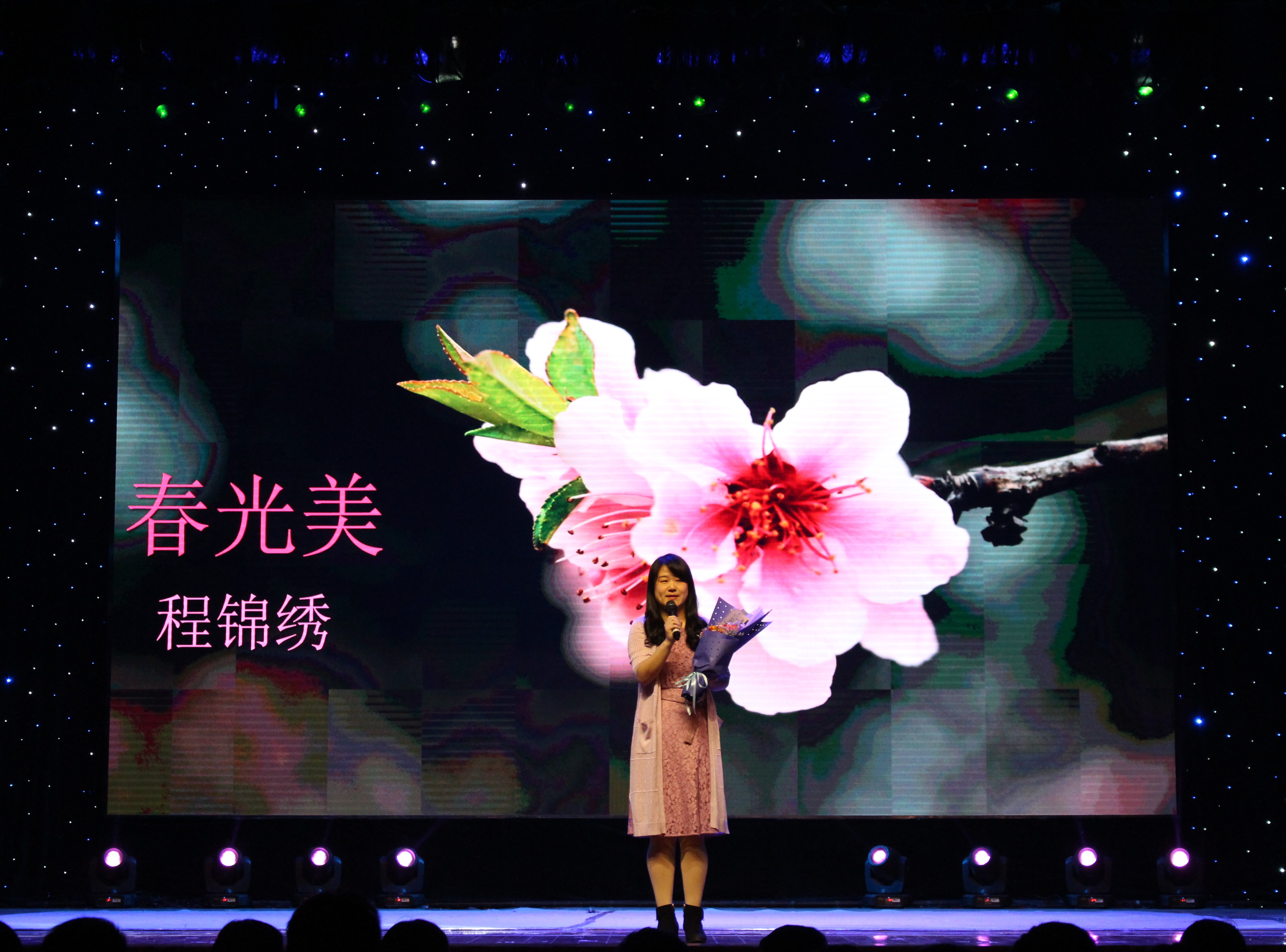 接下来,留法归来的丁杨老师带来的一曲浪漫清新的《说爱你》,满足了现场女生们的少女心,为晚会增添了浪漫元素。舞蹈《I Like That》中,达人舞团的舞者们脚踏轻快的节拍,充分展现了她们的灵巧之美,给观众带来了惊喜。随后,歌曲联唱《东风志》、《City of Stars》等轮番上阵。在镁光灯下,整个现场如梦似幻,跳跃的音符仿佛华美的月光洒落,台下的师生也徜徉在优美的旋律中如痴如醉。在《时间煮雨》中,高丽萍老师的歌声如水般流淌。接着,聂鹏老师用低沉的嗓音将《从何说起》演绎得酣畅淋漓,动人地吟唱着诗与远方,爱与理想。