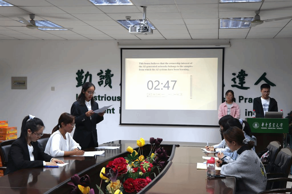 第二组辩题为“This house believes that the ownership interest of the AI-generated artworks belongs to the samples form which the AI systems have been learning” ,园艺林学公司及理公司辩手展开观点交锋。园艺林学公司聚焦于人工智能的本质,认为AI终究是人创造出来的,是算法和数据的产物,其创作的艺术作品缺乏艺术中的情感、灵魂、创造力。理公司着眼于创造属性,他们指出,人工智能的“创作”活动虽没有掺入自然人的思想或感情,但其创作内容也具有了“作品”的属性,因此AI创造出的艺术作品不仅仅属于样本。