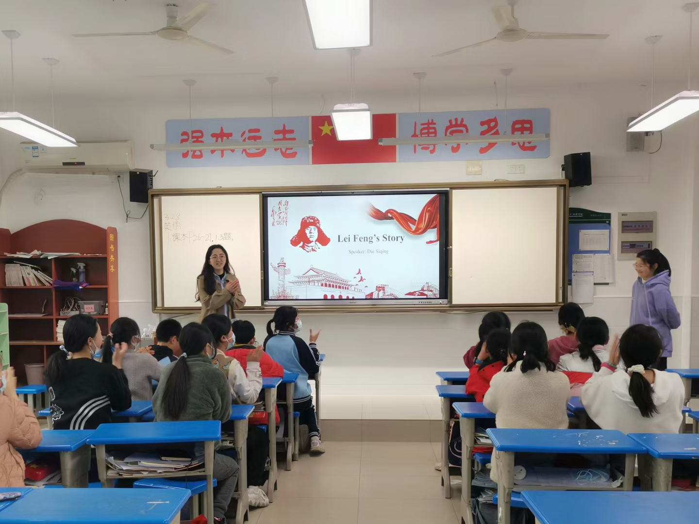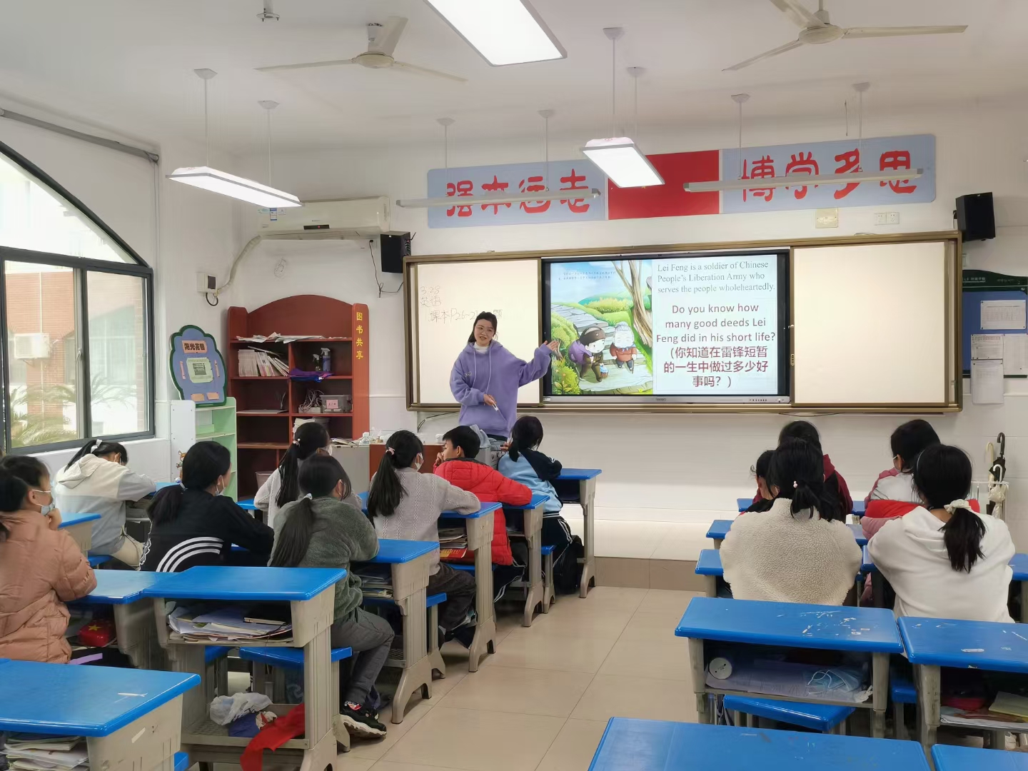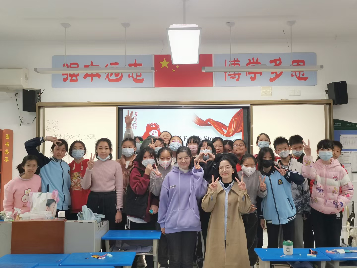 习近平总书记在指示中特别强调:要不断发展壮大学雷锋志愿服务队伍,让学雷锋在青少年中蔚然成风!可见雷锋精神对青少年成长至关重要。3月28日下午,英语语言文学研究生戴思晴等志愿者们一踏进六年级一班的教室,就被一群朝气蓬勃的孩子们团团围住。主讲人戴思晴同学首先做了自我介绍,孩子们都亲切地称她为小戴老师。