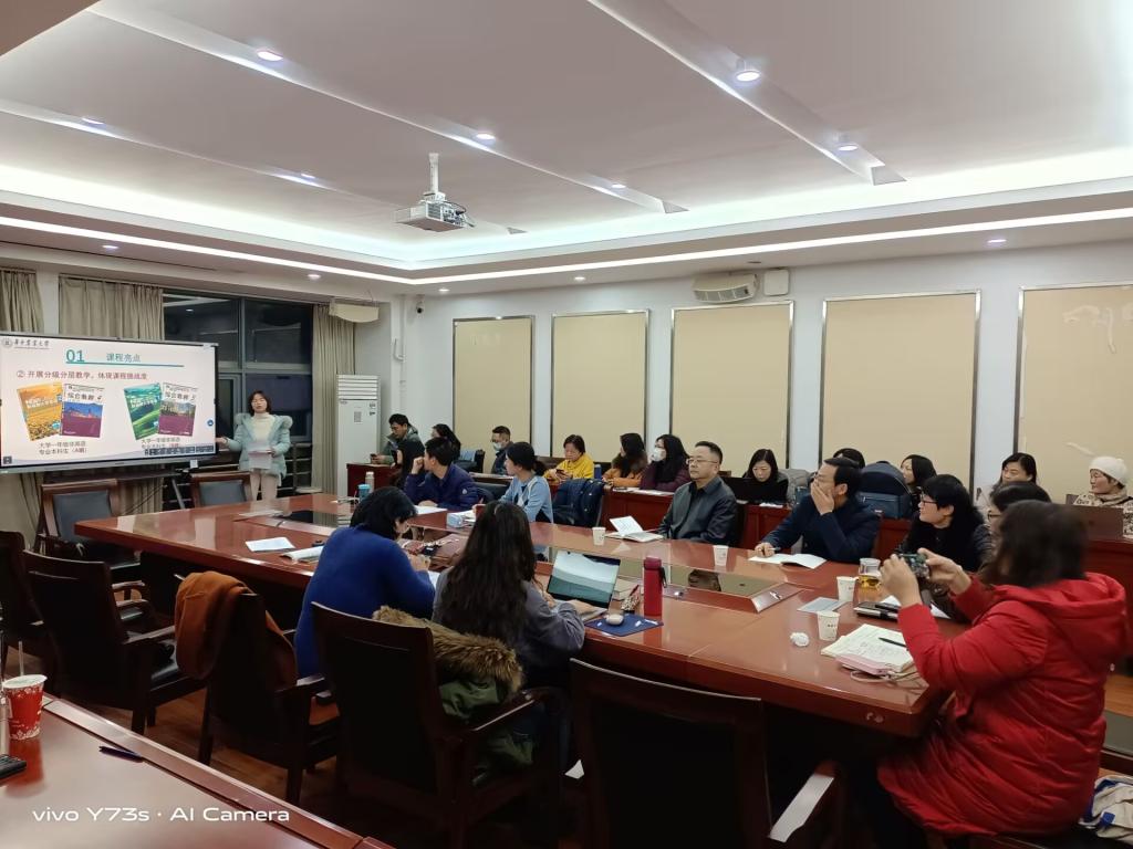 随后,通用英语教研室副主任章明汇报了《大学英语综合》课程本学期的教学改革亮点和需要关注的问题。为帮助新生熟悉华农校园学习和生活的方方面面,培养他们的英语口语交际能力,课程组不断完善《校园情境英语视听说》先修课程,增加英语导学环节,提升英语学习效率。本学期,通用英语教研室全面铺开基于SPOC的线上线下混合式教学模式,同时优化过程性考核评价体系,在教学中始终践行“三全育人、五育融通、师生融乐、全面发展”的教育理念,确保课程思政入微、入味、入心。