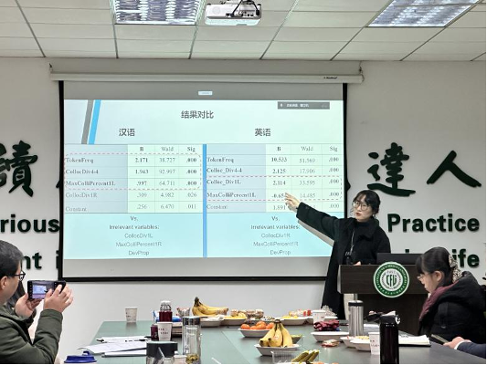 孙琳琳以“中英语料库中语法化测量的对比分析”为题,界定了“语法化”的定义,介绍了如何利用变化特征(词项频率、语义搭配、词类组合多样性、分布偏差等)测量中、英语料库中词项语法化程度。她指出,这四个主特征可以转化为七个变量,在二元逻辑回归模型中作为预测因子,对中、英语法化现象进行对比分析。最后,她详细总结了中、英语语法化的相似和相异之处。卢健老师在主持点评时,鼓励理论语言学方向研究生多了解“语法化”、“类型学”的相关内容,为做学术研究打下良好的理论基础。