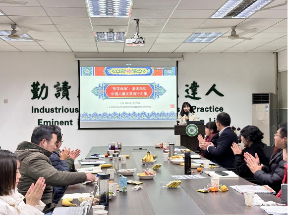 金蓓以“‘东学西渐’:清末民初中国儿童文学西行之旅”为题,首先剖析了儿童文学翻译研究的双重边缘地位,对“儿童文学”和“中国儿童文学”做了工作定义。随后,结合实例,从翻译目的与策略选择的视角,系统梳理了清末民初不同体裁的中国儿童文学外译情况。最后,她对清末民初儿童文学外译的文学和文化价值进行了深度解读。潘不寒老师在主持点评时认为,金老师的研究紧扣时代主题,有助于向世界传递中国声音和立场,同时指出“如何将儿童文学的共通之处和当前主流文化并行,以达到更好的传播效果,值得大家深入思考和研究。”