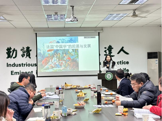 田婧以“法国‘中国学’的起源与发展”为题,首先界定了“汉学”(Sinology)和“中国学”(China Studies)的概念,概要评析了近代西方区域国别研究的两大路径(东方学路径和美国的区域研究)。随后,田老师梳理18至21世纪的法国“中国学”发展历程,介绍其间出现的重要学者及其论著、研究机构等学术资源。最后,田老师总结到:法国传统汉学仍是当代法国“中国学”研究的重要组成部分,同时指明去“文化中心主义”是构建可持续发展、对接世界的学术话语体系的基本原则。耿云冬老师在主持点评时指出,法国“中国学”研究是世界各国“中国学”研究的重要流派,对推进当下的“世界中国学”知识体系、学科体系与话语体系建设具有重要现实意义,建议研究生开拓学术研究视野,尝试将语言学、小说译介等研究选题放在区域国别的视角下进行探讨。