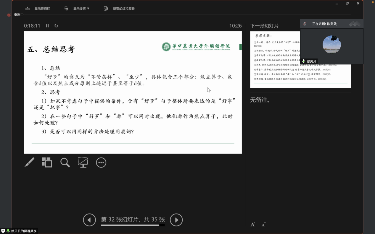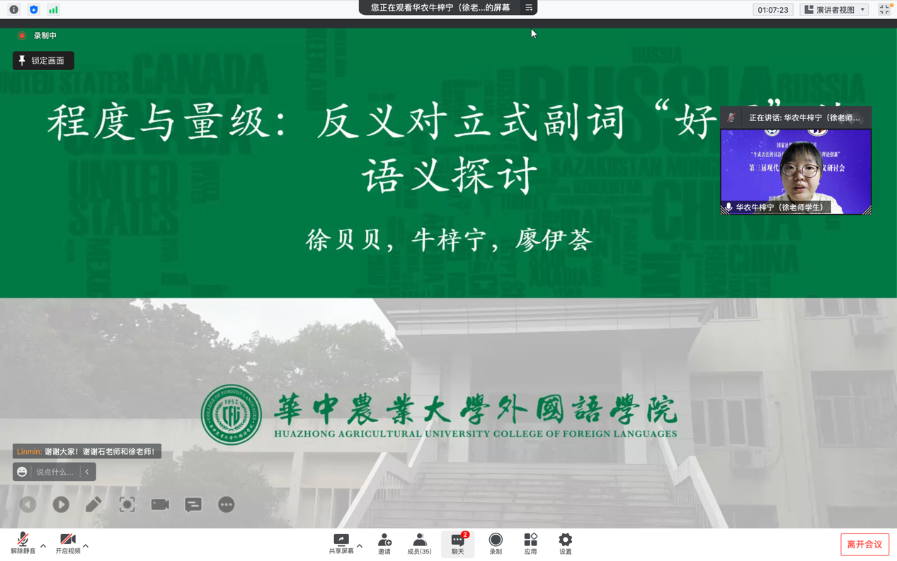 4月17日上午,公司师生在会上做了名为“程度与量级:反义对立式副词‘好歹’的语义探讨”的汇报发言。整个发言分引言、前人研究、分析过程、语料解释和总结思考五个部分,前两部分由牛梓宁负责汇报,后三部分由徐贝贝负责汇报。报告时间一共50分钟。