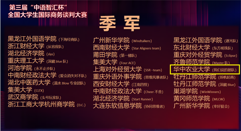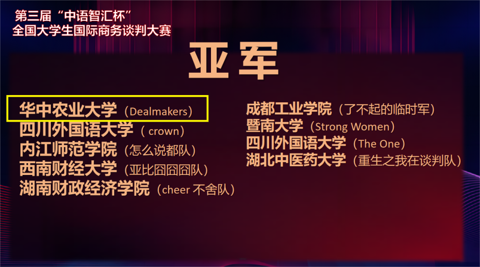 其中,Dealmakers团队(秦令帅、杨冰宇、陈梦炫、金夏仪)勇夺全国亚军;我们说的都队(刘卓舟、张芷培、李玉舒、韦钦文)荣获全国季军;First Squad团队(周伟平、华森怡、李慧敏、刘明杰)获区域赛二等奖。此外,金夏仪和刘卓舟两位选手表现卓越,荣膺单项奖“商谈精英”称号。
