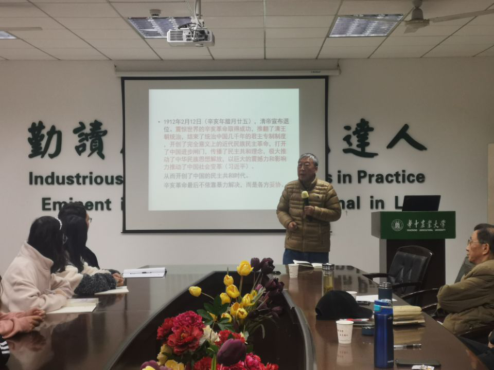 随后,蔡礼鸿教授着眼于武汉是中国革命重地这一背景,重点讲述了辛亥革命这一意义深远的历史事件。通过概括性介绍辛亥革命的起因、过程和结果,蔡教授为同志们总结了这一伟大革命的意义和历史经验,指出了党中央对于辛亥革命的高度肯定。通过引用“惟愿诸君将振兴中国之责任,置之于自身之肩上”这一警句,蔡教授对在座同志寄予了殷切的期望,呼吁同志们发扬孙中山先生等辛亥革命先驱的伟大精神,携手向着中华民族伟大复兴的目标奋勇前进。