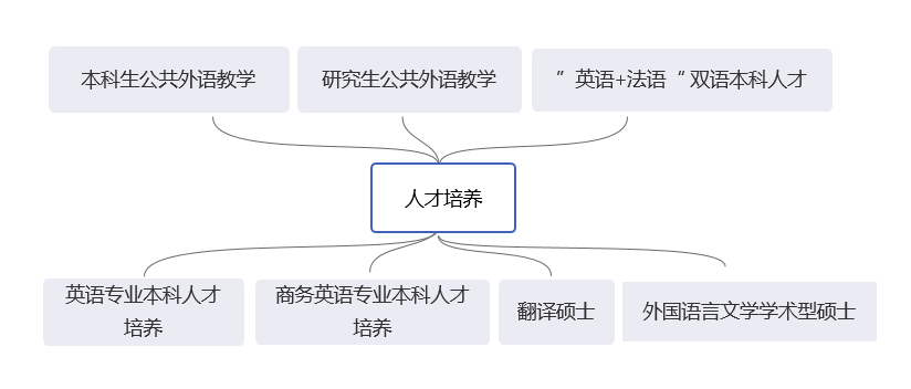 公司承担全校公共外语教学,有英语和商务英语2个本科专业、外国语言文学一级学科硕士学位授权点和翻译硕士专业学位授权点。